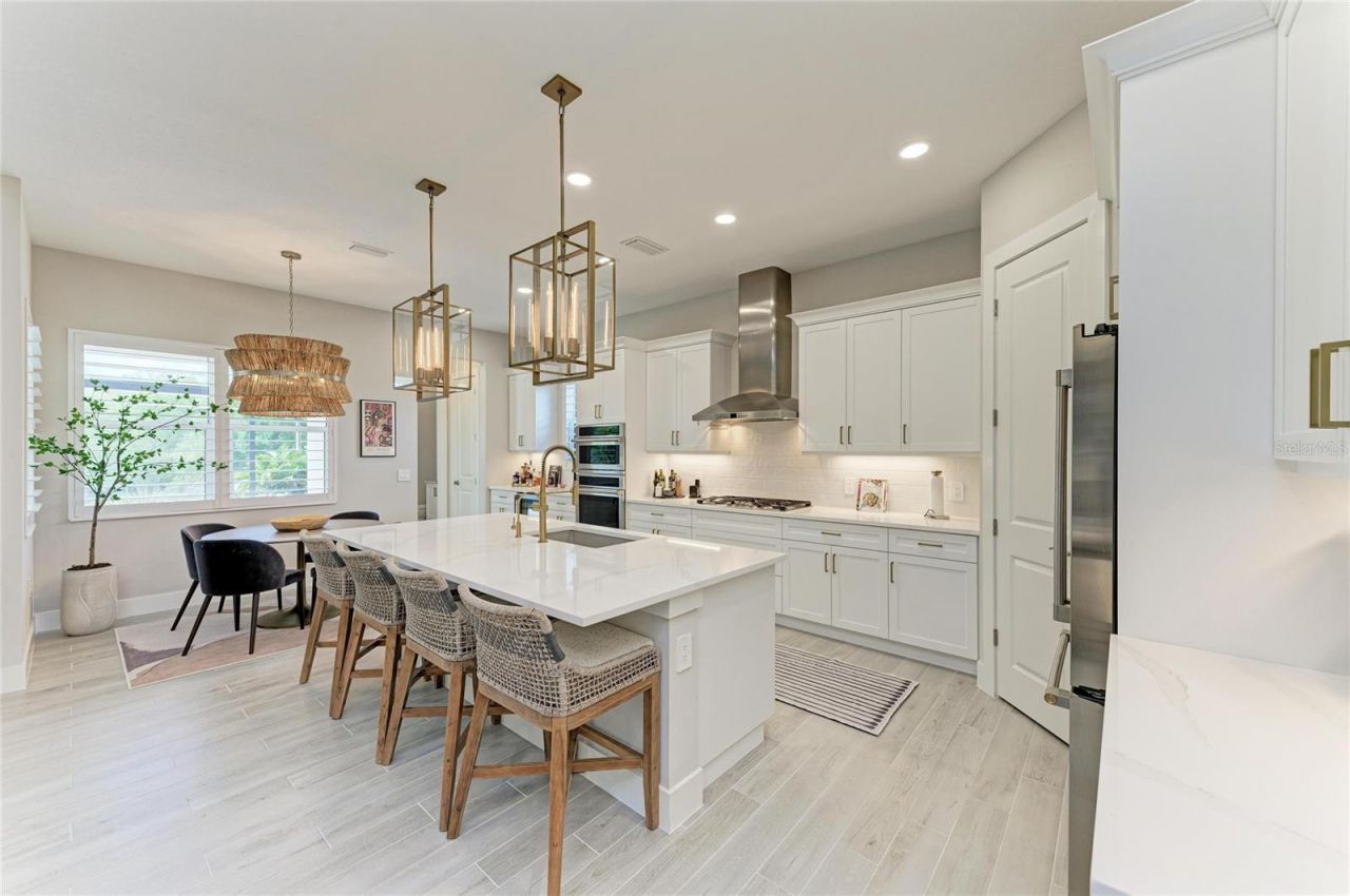 Experience the pinnacle of refined Florida living in this exceptional Homes by Towne Capstan residence, offering 2,452 square feet of impeccably curated space with 3 bedrooms, a private den, and 2.5 baths. Thoughtfully designed and extensively upgraded, this home blends architectural drama with effortless livability. From the moment you enter, soaring tray ceilings, dramatic lighting, fireplace and custom built-ins create a grand yet welcoming ambiance throughout the foyer, great room, dining area, and primary suite. The gourmet kitchen is both sophisticated and functional - appointed with a six-burner cooktop, convection wall oven and microwave, French door refrigerator, extended custom cabinetry, and a built-in wine center. An oversized island invites gathering and seamless entertaining. Privately positioned, the primary suite is a serene retreat featuring tranquil preserve views, a large walk-in closet, and a spa-inspired bath with dual vanities and an expansive walk-in shower. Two additional guest suites provide elevated comfort for family and visitors. The spacious office offers a refined workspace or library, while the mudroom and fully outfitted laundry room add everyday convenience. Designed to embrace Florida's coveted indoor-outdoor lifestyle, the expansive covered lanai showcases a luxurious pool and spa overlooking a private preserve setting. Gas rough-in for a future outdoor kitchen allows for further customization. Notable enhancements include Impact-rated windows, whole-house water filtration system with reverse osmosis in the kitchen, security system, three-car garage with epoxy flooring and professional landscaping. Located in LakeHouse Cove at Waterside, residents enjoy a resort-caliber lifestyle with a lakefront pool and spa, state-of-the-art fitness center, six pickleball courts, two dog parks, a boathouse, and kayak launch. A short stroll brings you to Waterside Place, where fine dining, boutiques, and vibrant community events create an unmatched walkable experience. Just minutes from the cultural charm of Sarasota, the luxury shopping of University Town Center, and the pristine beaches of the Gulf Coast with Walt Disney World approximately two hours away - this residence offers both privacy and connectivity. This is more than a home; it is a statement of distinction and an invitation to live exceptionally.